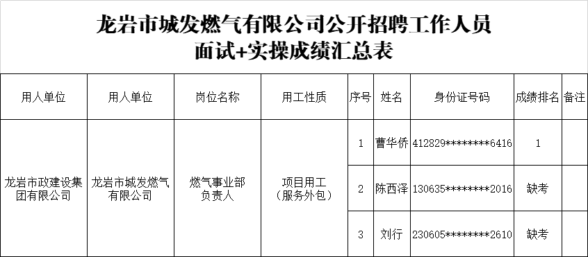 龍巖市政建設(shè)集團(tuán)有限公司所屬企業(yè)公開招聘工作人員擬錄用公示 根據(jù) 2025年4月21日發(fā)布的《龍巖市政建設(shè)集團(tuán)有限公司關(guān)于公開招聘工作人員的公告》有關(guān)要求,經(jīng)報(bào)名、資格審查、組織考試、體檢、考察等程序,現(xiàn)將龍巖市城發(fā)燃?xì)庥邢薰救細(xì)馐聵I(yè)部負(fù)責(zé)人崗位擬錄用人員名…
